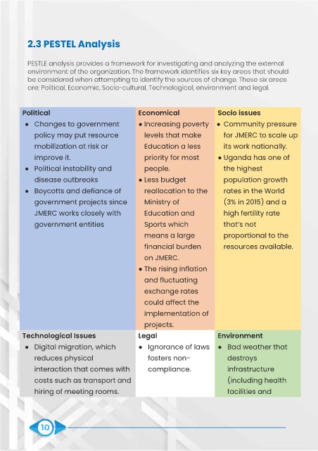 are: Political, Economic, Socio-cultural, Technological, environment and legal.